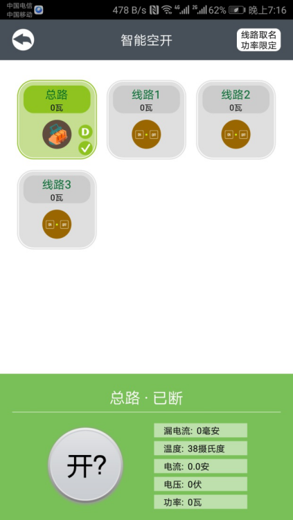 個人手機客戶端個人用戶通過手機號、微信、QQ登陸遠程設置、查詢、遙控或定時開關自動完成漏電保護功能自檢分線路用電計量,故障實時報警等。