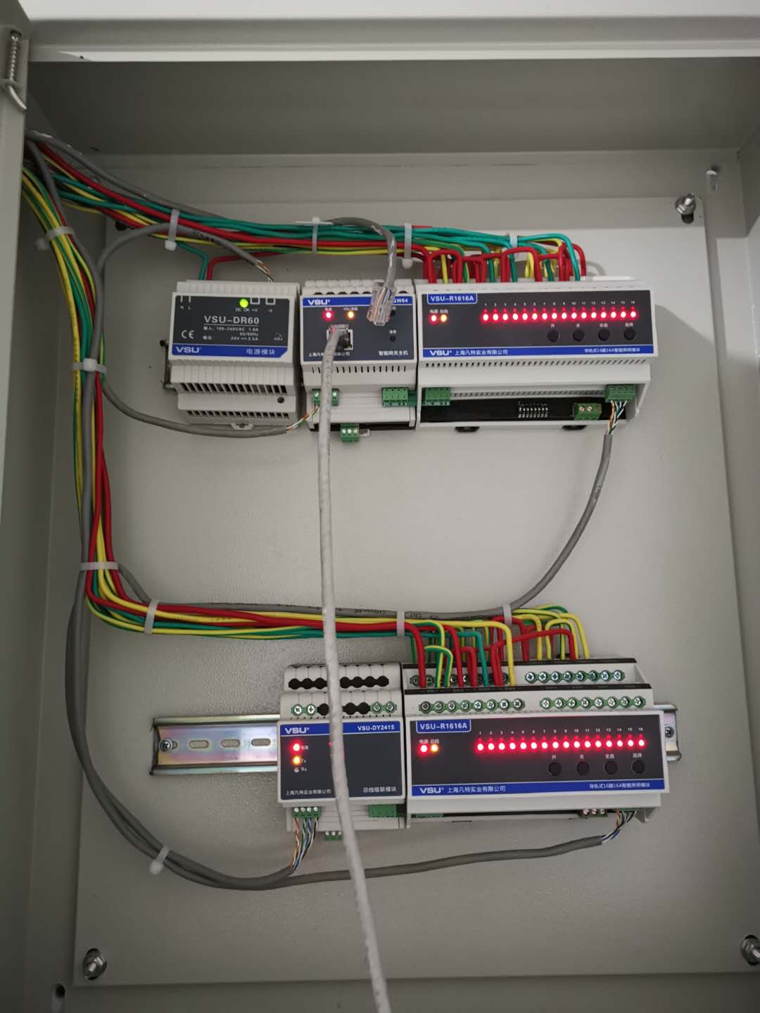 采用VSU總線型成套產(chǎn)品:智能網(wǎng)關(guān)主機(jī)控制整體,接受到手機(jī)或面板的指令輸送到開關(guān)執(zhí)行模塊進(jìn)行遠(yuǎn)程開關(guān)燈操作,采用的照明模塊是16路16A的,搭配DR60電源模塊、級(jí)聯(lián)模塊確保供電充沛??偩€的特點(diǎn)是連產(chǎn)品的調(diào)試檢測(cè)都不需要到現(xiàn)場(chǎng),遠(yuǎn)程即可將其調(diào)試就位。這個(gè)項(xiàng)目甚至連我司技術(shù)人員遠(yuǎn)程協(xié)助都不需要自己就安裝完成,可見其有多便于安裝,加上連接片用于串聯(lián)模塊,不是專業(yè)人員也可自主安裝使用。