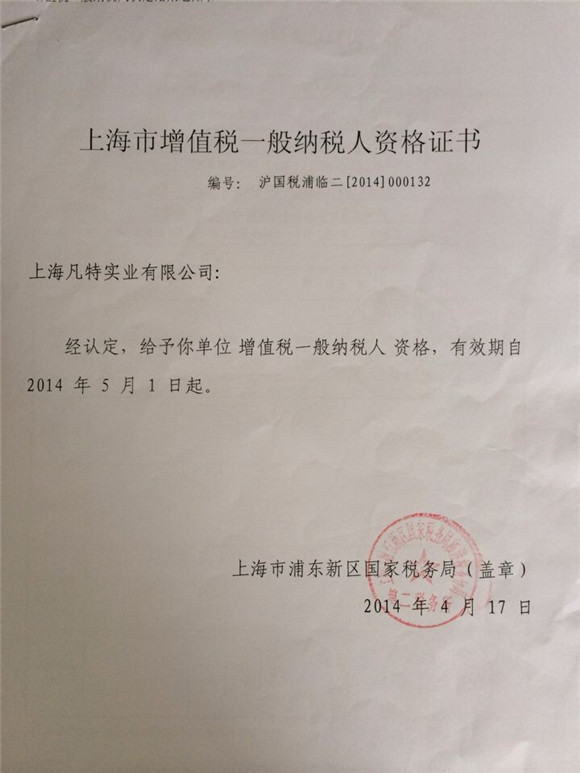 上海市增值稅一般納稅人資格證書